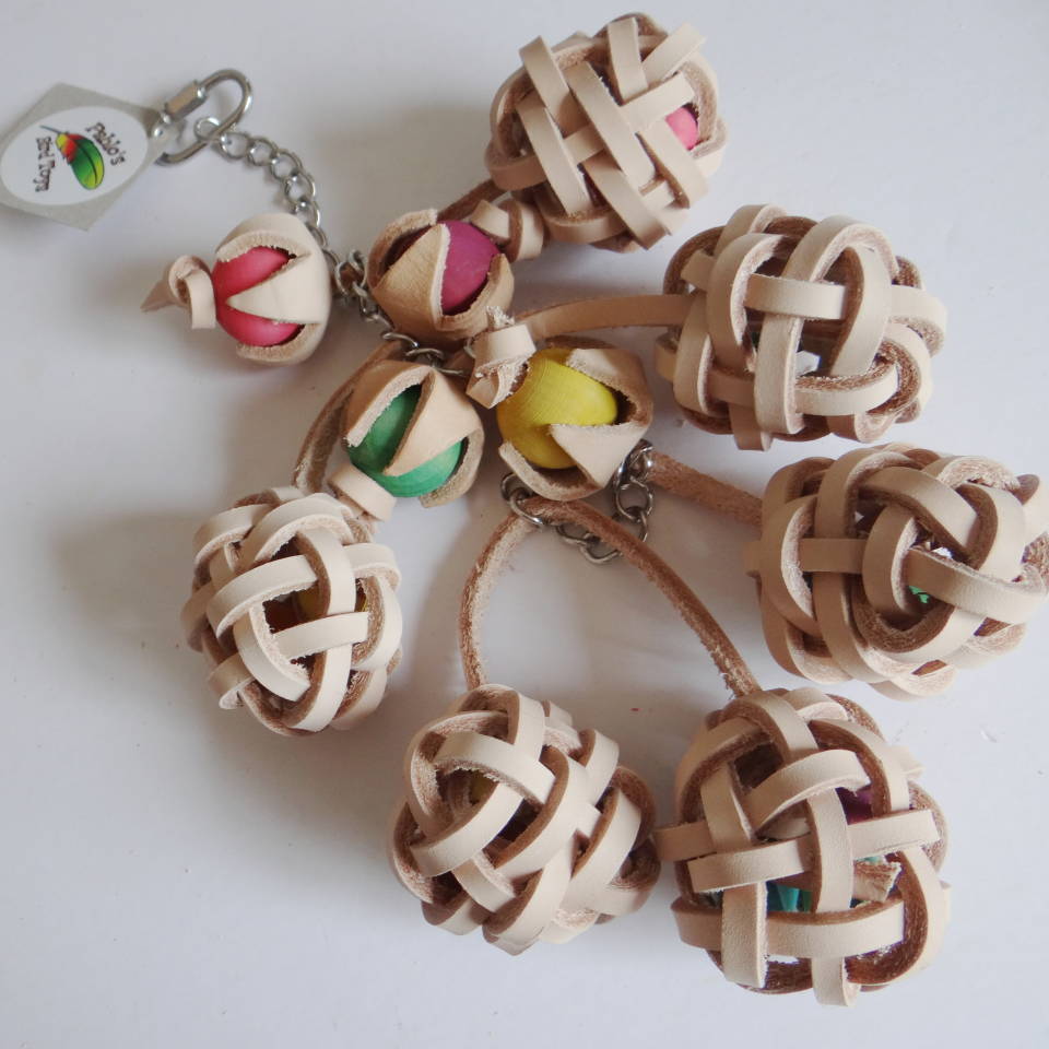 Each leather ball is filled with wooden beads. You can squeeze in some nuts and treat to make more fun.